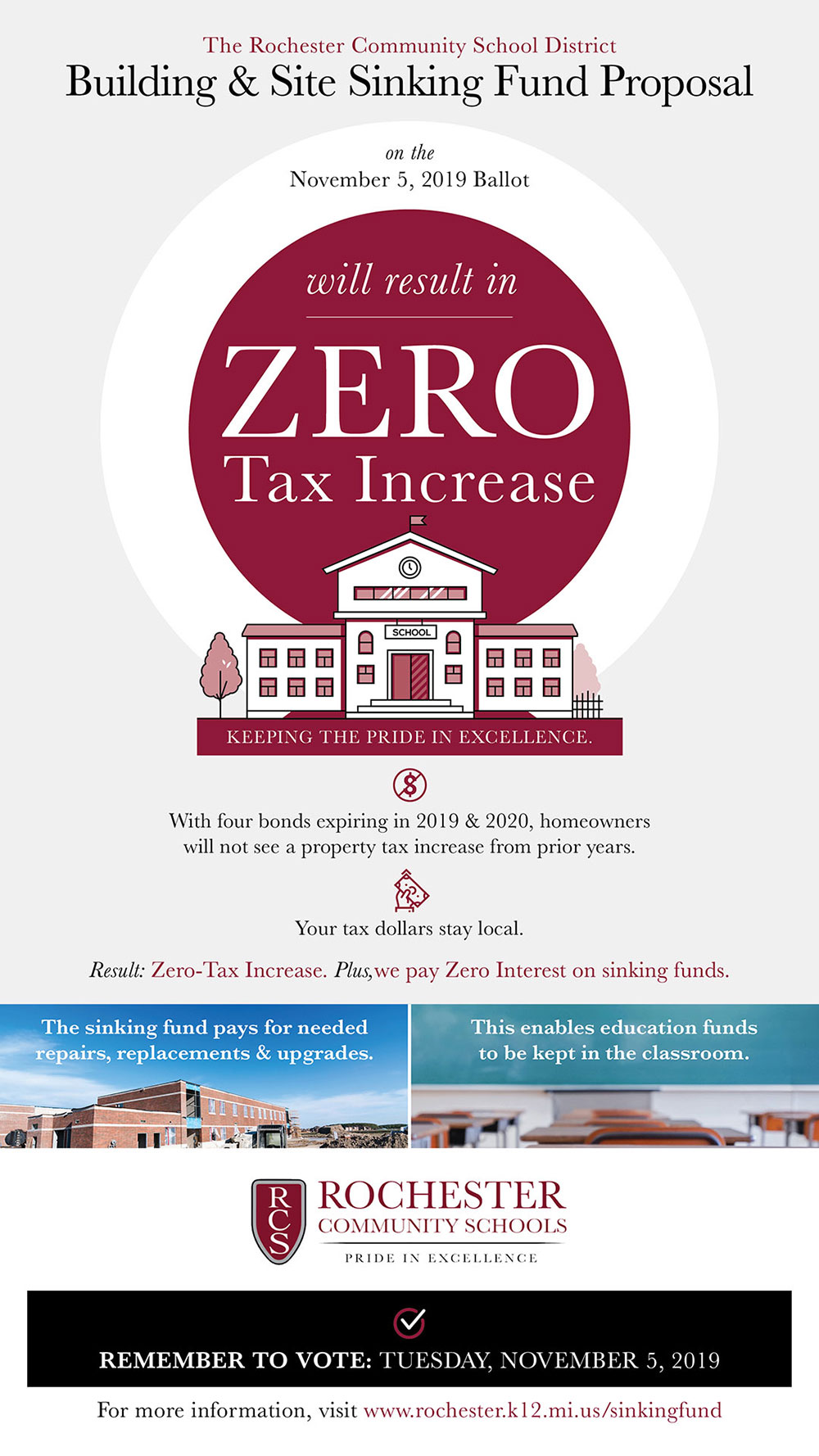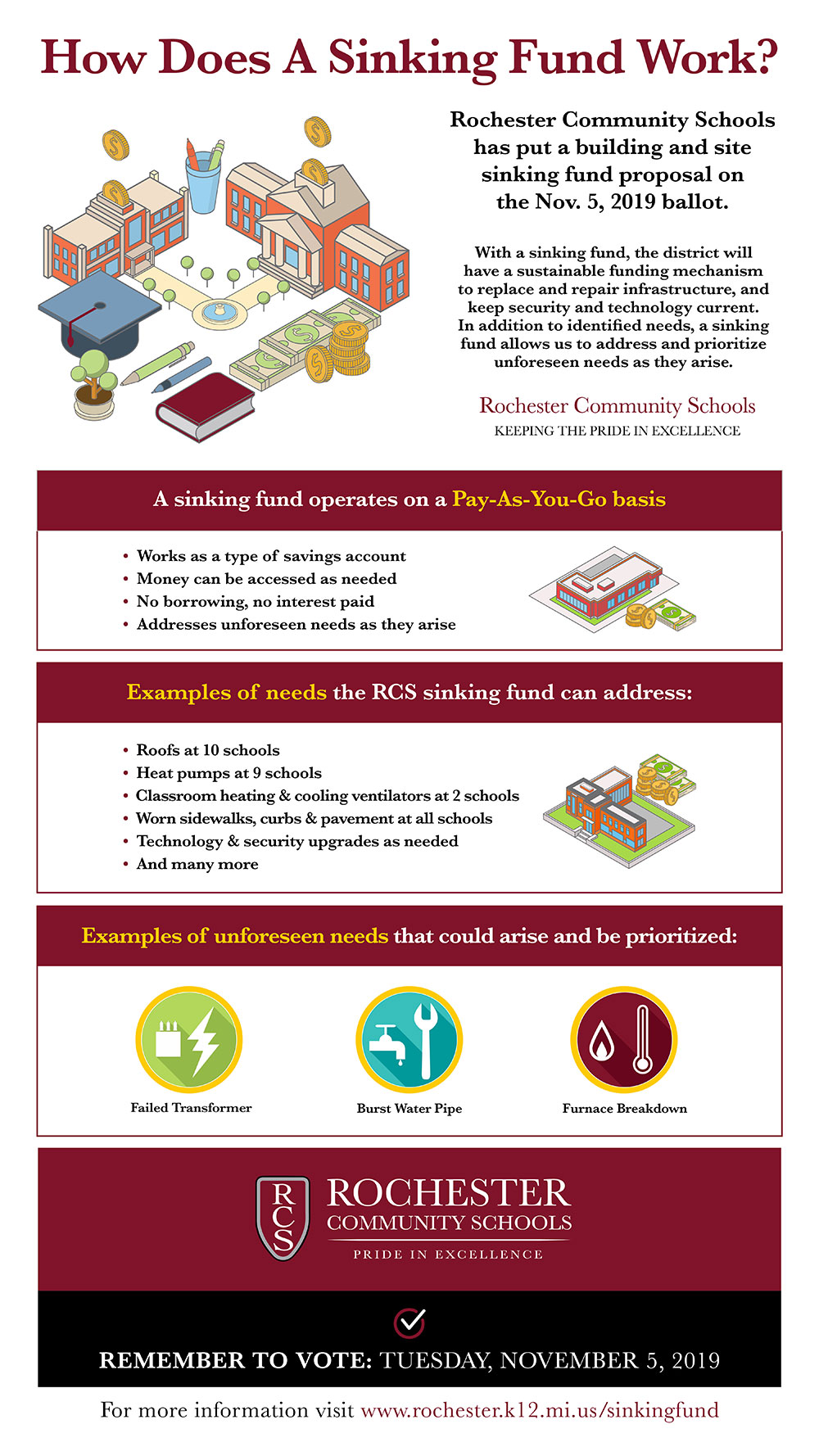 A sinking fund is a millage levied in Michigan dedicated to supporting the repair and construction of school buildings. It is a pay-as-you-go method for building repairs and projects. Unlike a loan, the district does not pay any interest on the money used.